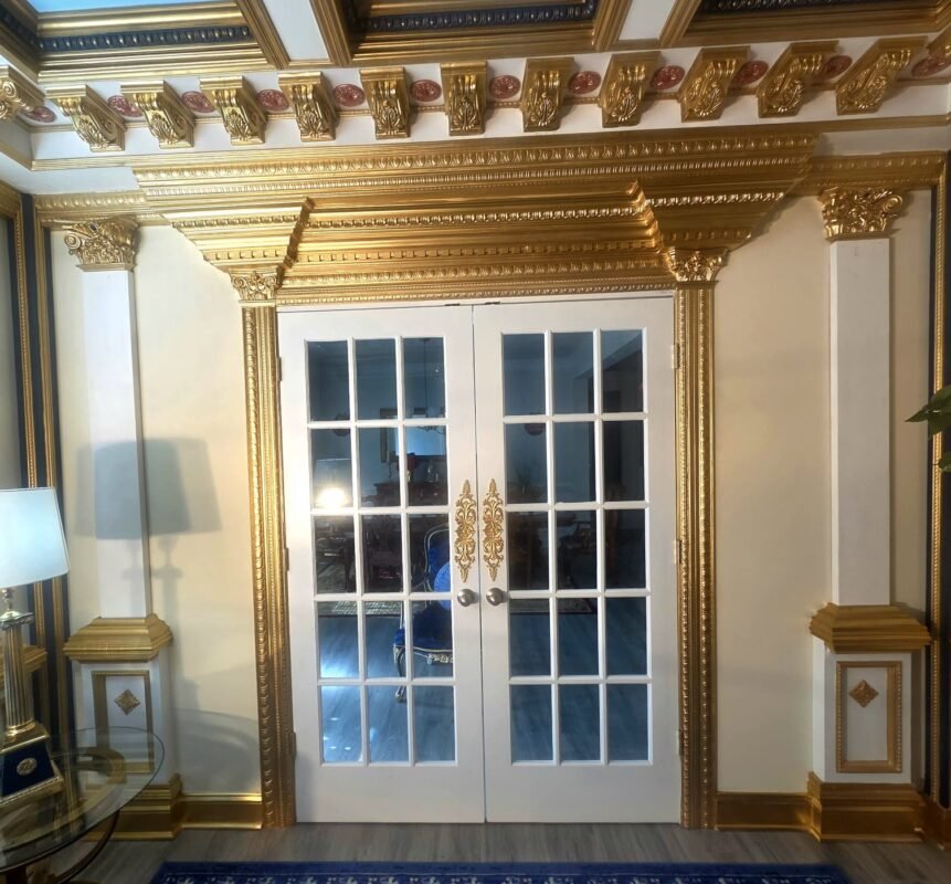 In this wall, I created this stunning interior doorway, masterfully designed to evoke the grandeur of classical European elegance. Every detail— from the lavish gold trim to the exquisite molding and decorative corbels— radiates luxury and artistic flair, transforming any space into a regal masterpiece. Imagine this breathtaking doorway gracing your home or office, or let’s collaborate to create a custom project that perfectly captures your vision. Bring classical beauty and unparalleled craftsmanship into your life— let’s make it happen together.