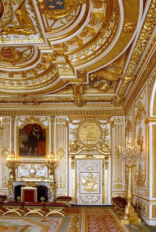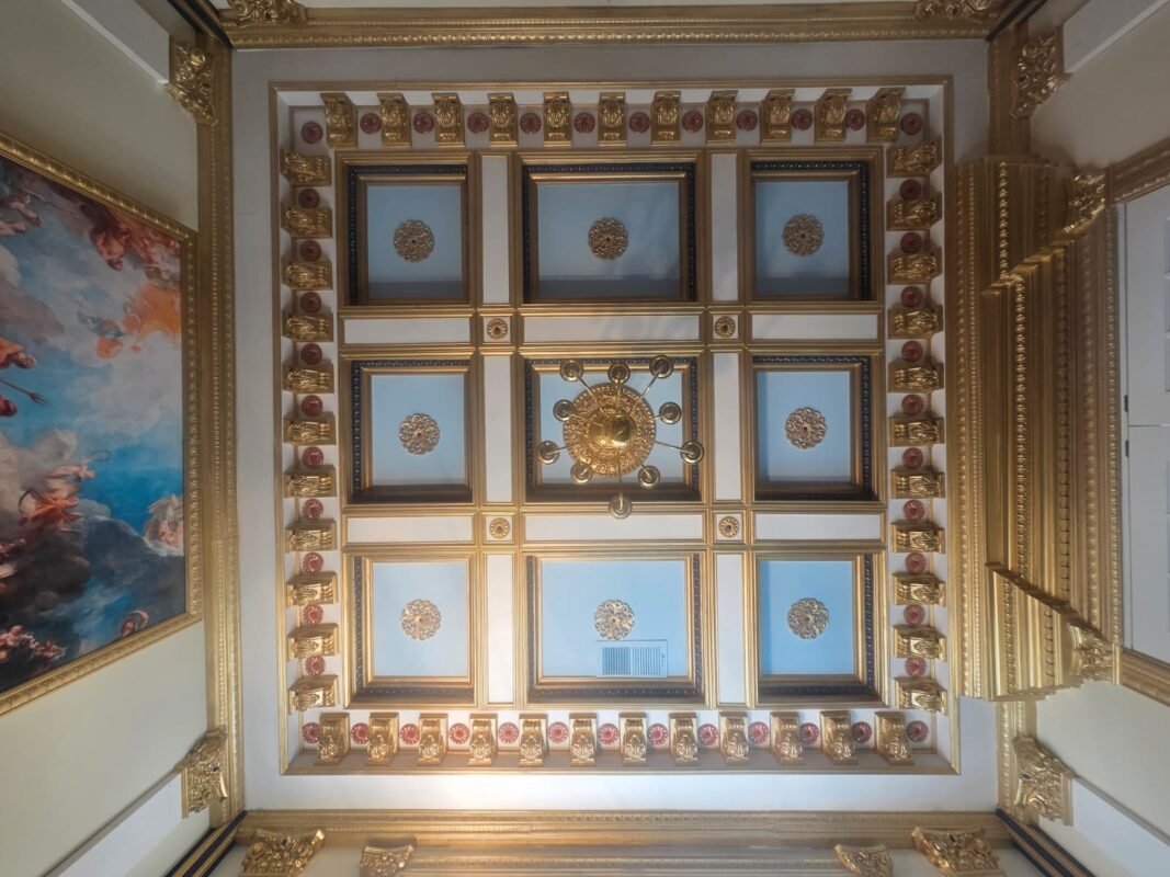 The Central painting is a copy of the Apotheosis of Hercules, painted by Francois Lemoyne, which is in the Palace of Versailles.