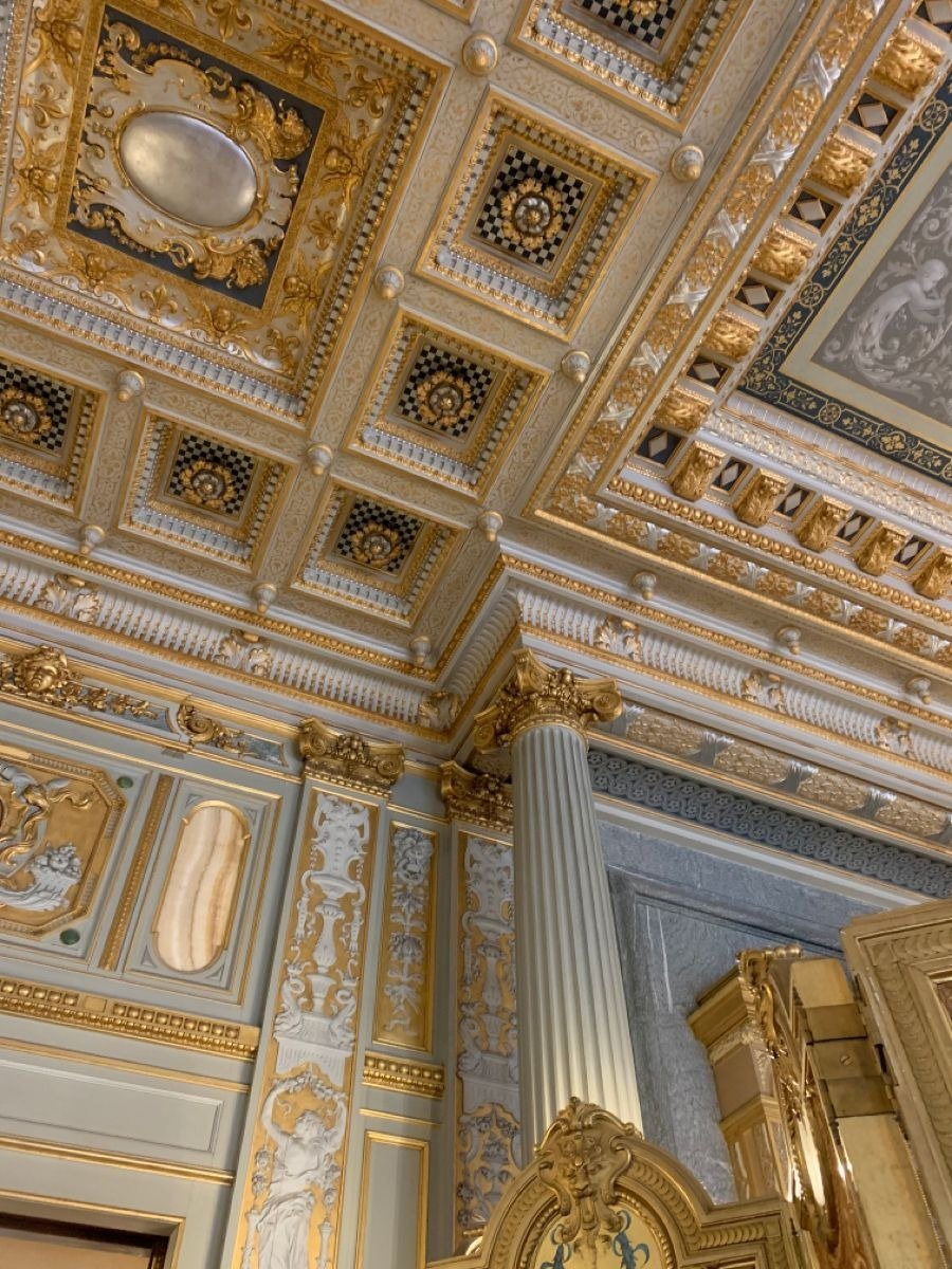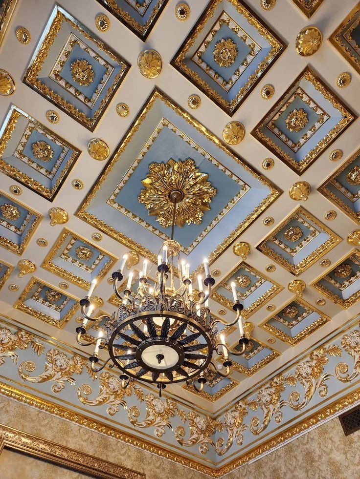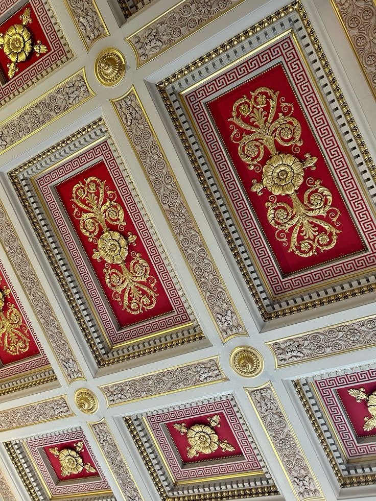 To compose this ceiling, I was inspired by the ceiling of the Library du Palais du Luxembourg. I created this perfectly symmetrical square panel adorned with radiant gold borders, establishing a regal and harmonious rhythm throughout the space. The ceiling’s intricate craftsmanship and lavish, layered ornamentation were meticulously designed to captivate and leave a lasting impression—making the environment truly unforgettable.