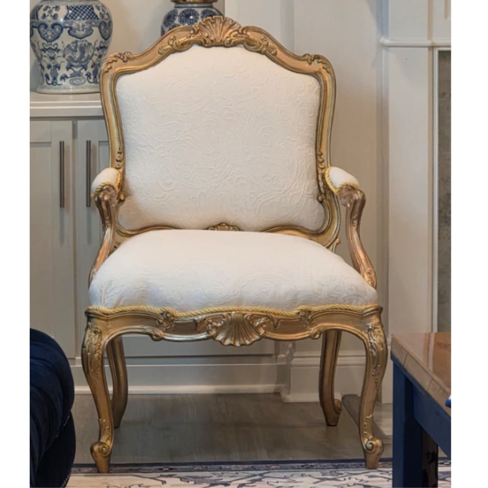 French Louis XV-style armchair with a gilded wooden frame adorned with intricate floral and shell-like carvings. Gracefully curved Cabriole legs terminating in scrolled feet for stability. High-quality plush floral damask jacquard fabric upholstery reflects the comfort and lavishness of the Louis XV era.
